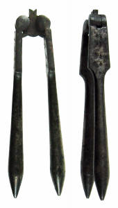 And more nut crackers!  (Also saw 2 places referred to as a Lobster cracker.) So far I have found over 10 and they are all located in the United Kingdom and most are referred to as from Victorian to early 1900's.  This has been referred to as a "Reversible hinge" or "double jointed" nut cracker.  Can be used either way you flip the handles and the end/hinge piece helps hold the larger or smaller nut!  The protruding gaped & tall one is also used to help pry the shells apart!
